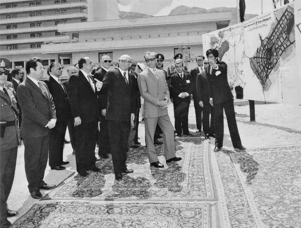 Projektpräsentation von Architekt Djamshid Farassat vor Shah Mohammad Reza Pahlavi für die Stadt Aryashahr (heute Fuladshahr), Isfahan, Iran, 1967–1983