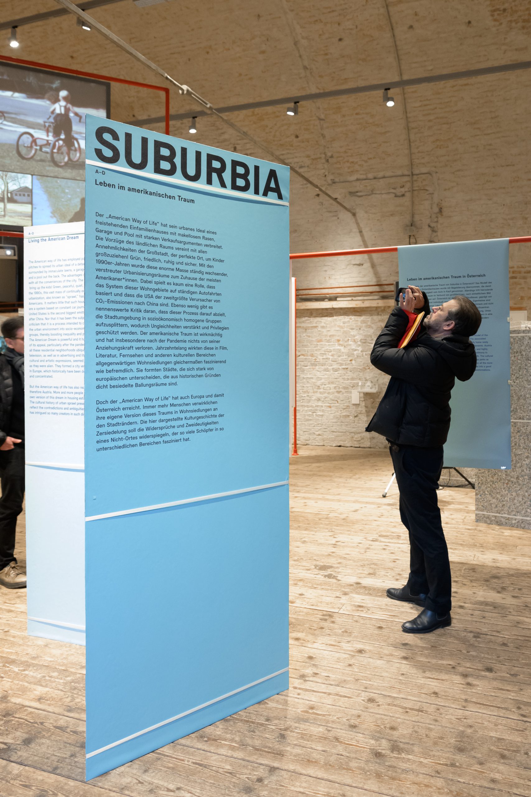 Die von Philipp Engel für das CCCB kuratierte Ausstellung wurde für das Az W adaptiert und um einen Österreichschwerpunkt erweitert. Auch hierzulande will immer noch ein Großteil der Menschen ihre eigene Version dieses Traums am Stadtrand verwirklichen. Laut einer aktuellen Studie der BOKU hat sich der Anteil der hoch zersiedelten Fläche in Österreich zwischen 1975–2020 verfünffacht – insbesondere durch freistehende Einfamilienhäuser, großflächige Gewerbegebiete und Einkaufszentren. In Folge zerstören Verkehrsflächen die Landschaft, die rasant fortschreitende Versiegelung bedroht die Biodiversität und die Ernährungssicherheit, Ortskerne veröden und die Menschen einer alternden Gesellschaft schlittern in die Isolation. Das Bild der halbverwaisten, in die Jahre gekommenen Häuser und Siedlungen prägt viele Teile des Landes. Anstatt neu zu bauen, stellt sich die Frage, wie der Bestand dieser rund 1,5 Millionen Einfamilienhäuser für die Zukunft nutzbar gemacht werden kann. Gelungene Beispiele von Umbauten, Umnutzungen, Nachverdichtungen oder neuen Wohn- und Arbeitsformen sollen das enorme Potenzial und attraktive Alternativen aufzeigen.
